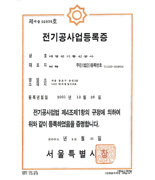 ¢Ã Àü±â°ø»ç¾÷µî·ÏÁõ